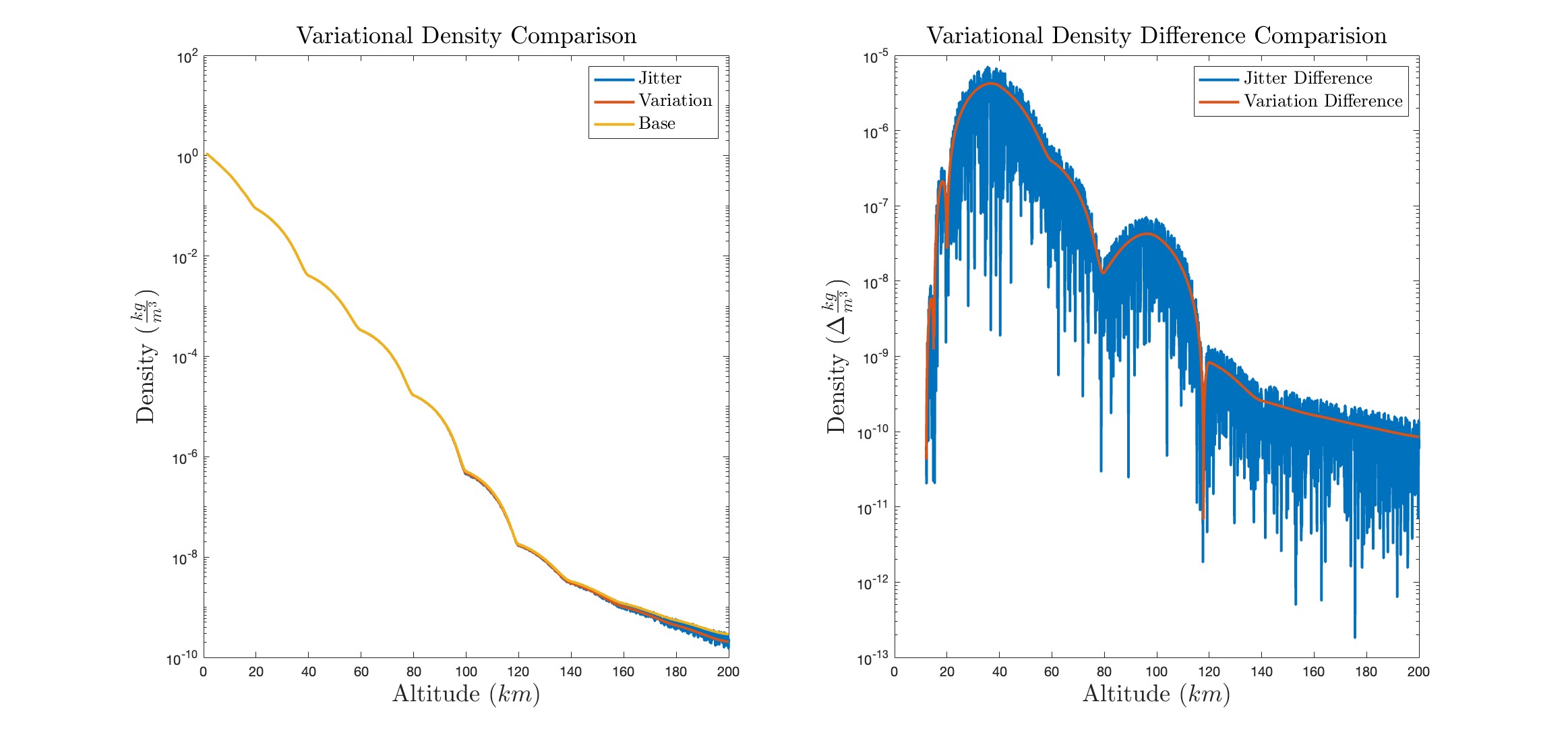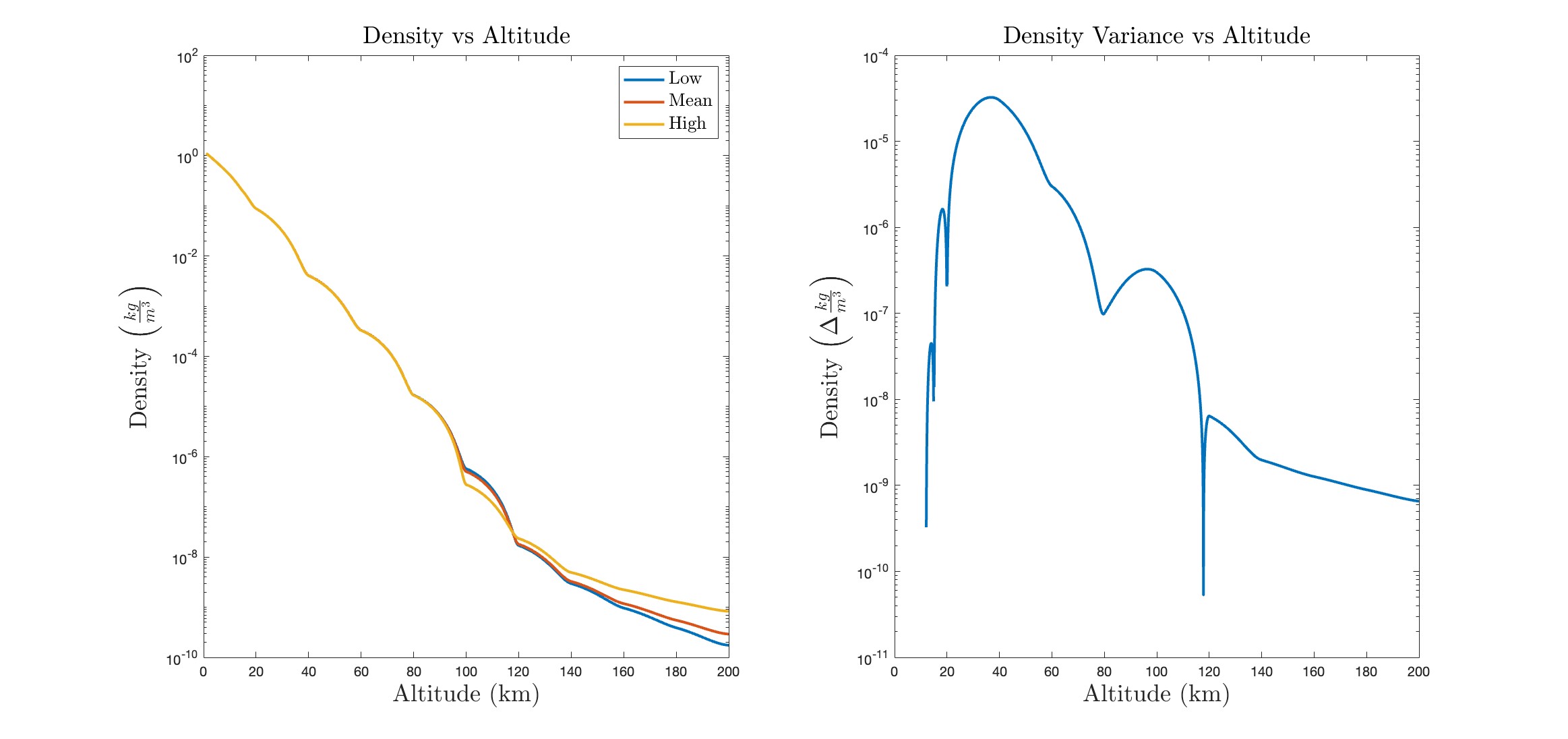 We consider drag using deterministic models that depend on a constant value, vary with altitude, vary with temperature and pressure, and probabilistic models that vary with a base offset value and a jittered offset, which includes a randomized base offset, that varies proportionally throughout the range of values, and a proportional randomized value that varies at each data point.