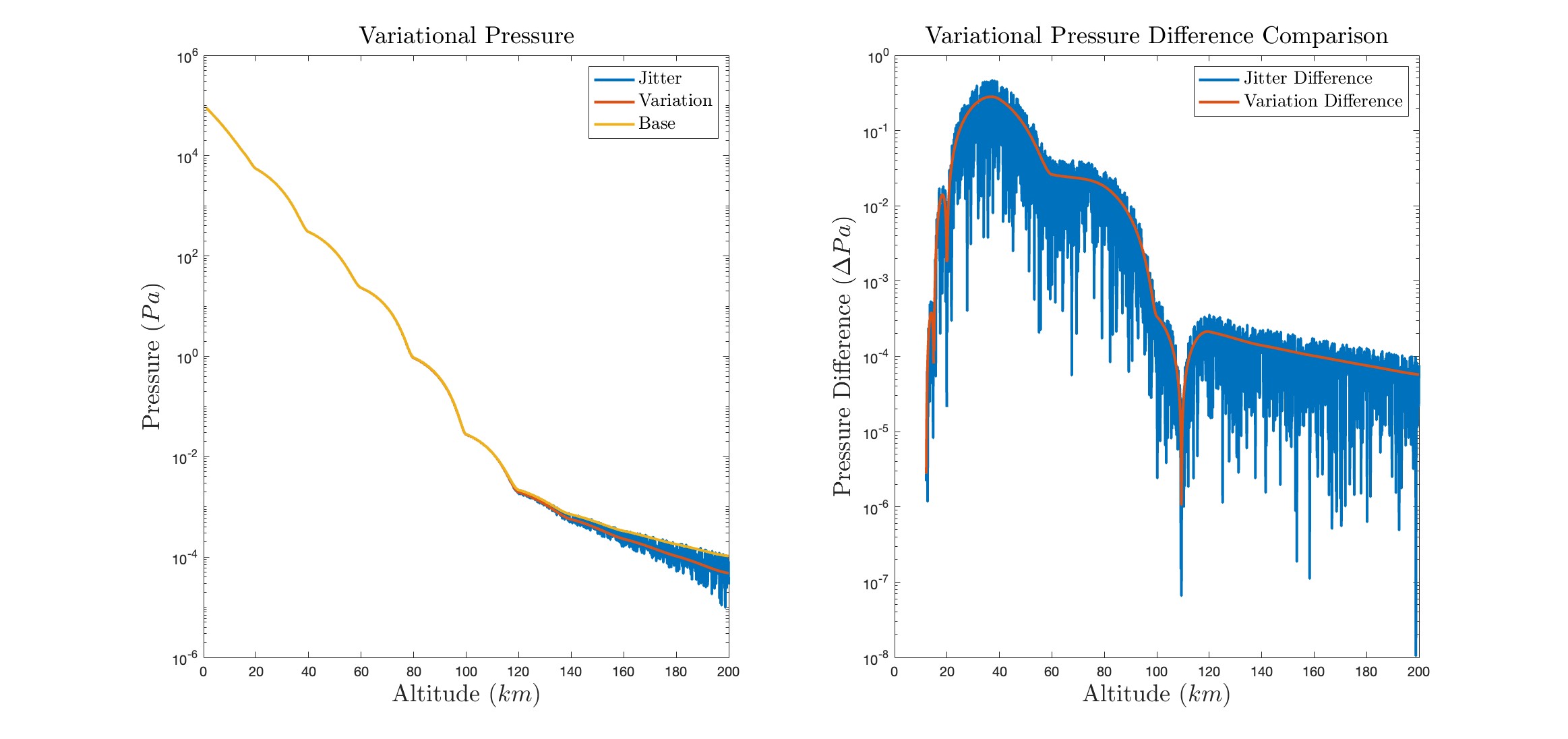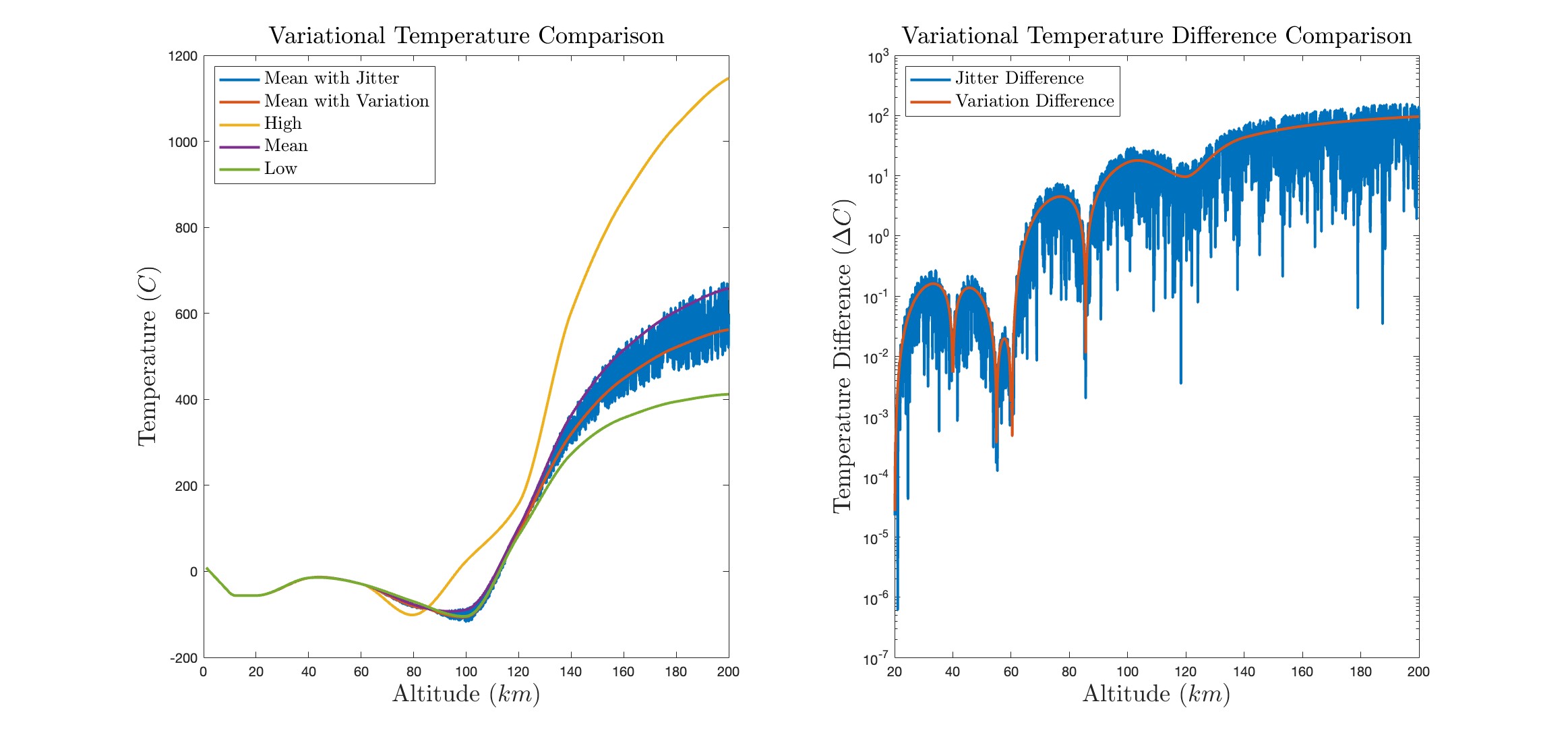 As far as the scale of application of this project, the variation in the temperature, pressure, and density of the is a marginal effect in variation of the modeled drag coefficients. In the low atmosphere, less than 40km altitude, there is almost no variation in temperature due to solar activity. Specifically, solar temperature variation between 20km and 40km altitude contributes to a change of less than 1ºC. In these models, it would be more appropriate to study climatic, solar geometric factors of seasons, or other factors the would increase the magnitude of variation at low altitude.