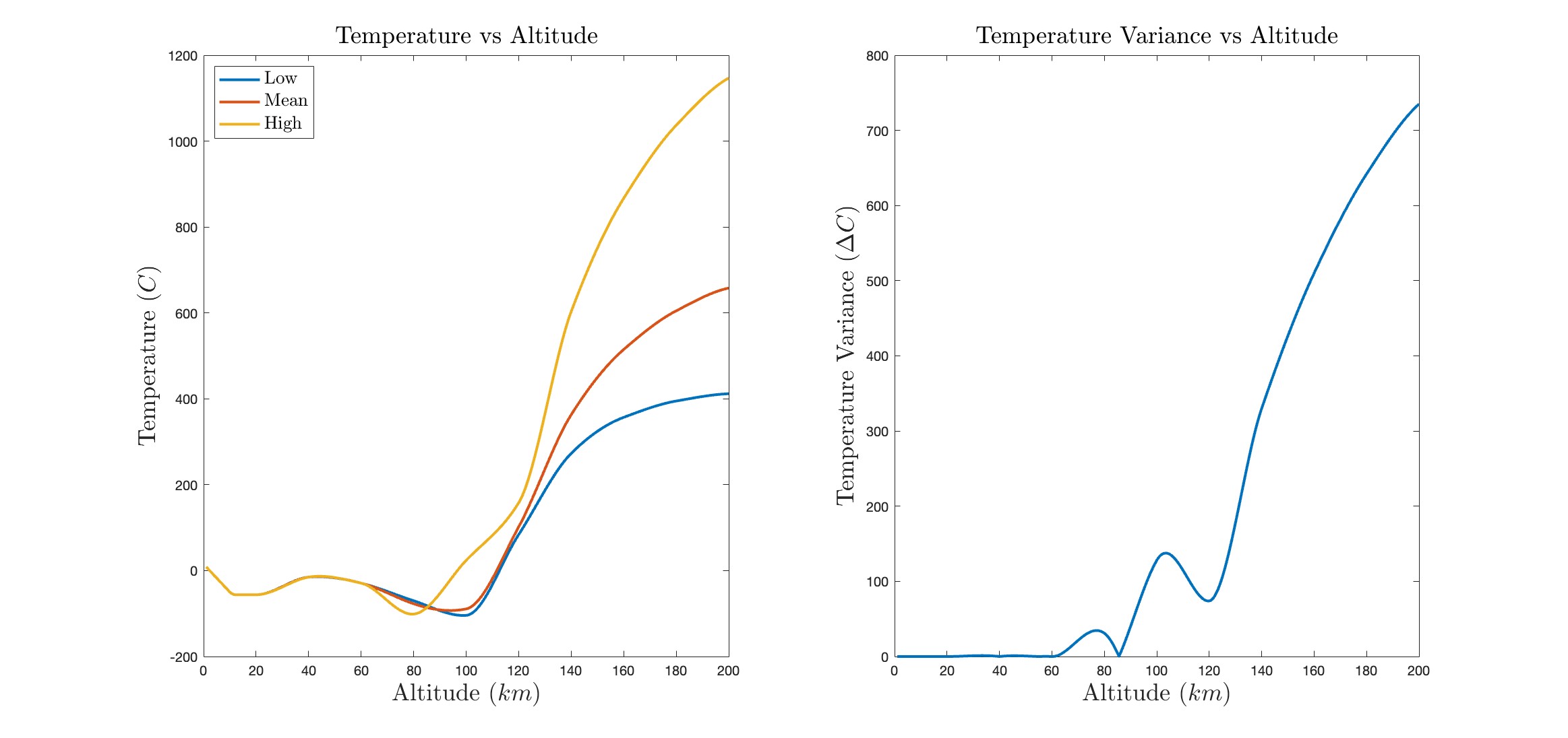 We model temperature based on the known values to at kilometers of altitude above earth surface to consider low-, mid-, and high- solar activity generate a range range of values. Temperature variance, due to solar activity, has a marginal influence below 60km altitude.
